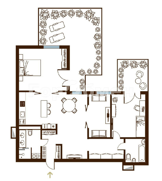 Квартира расположена на 5 этаже и имеет два выхода на огороженные террасы площадью 40 м2 и 10 м2. Террасы оборудованы электро- и водоснабжением, что делает их идеальным местом для отдыха. Общая площадь с террасами составляет 144 м2.