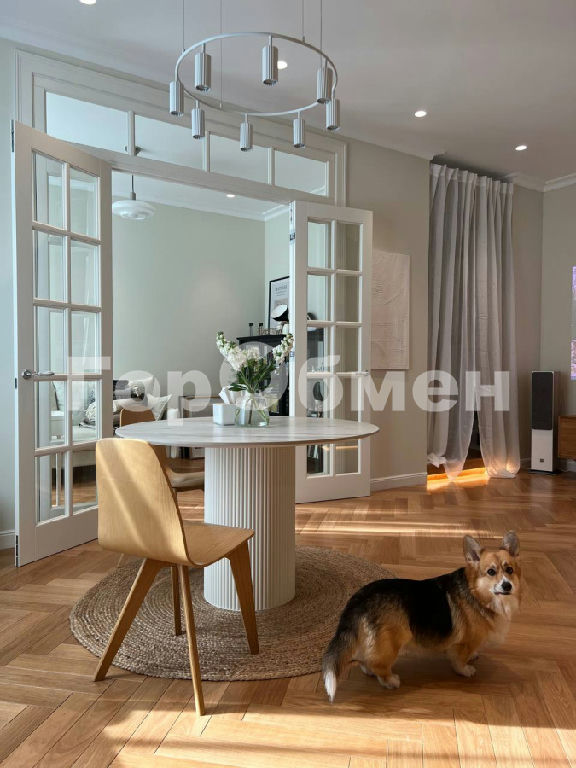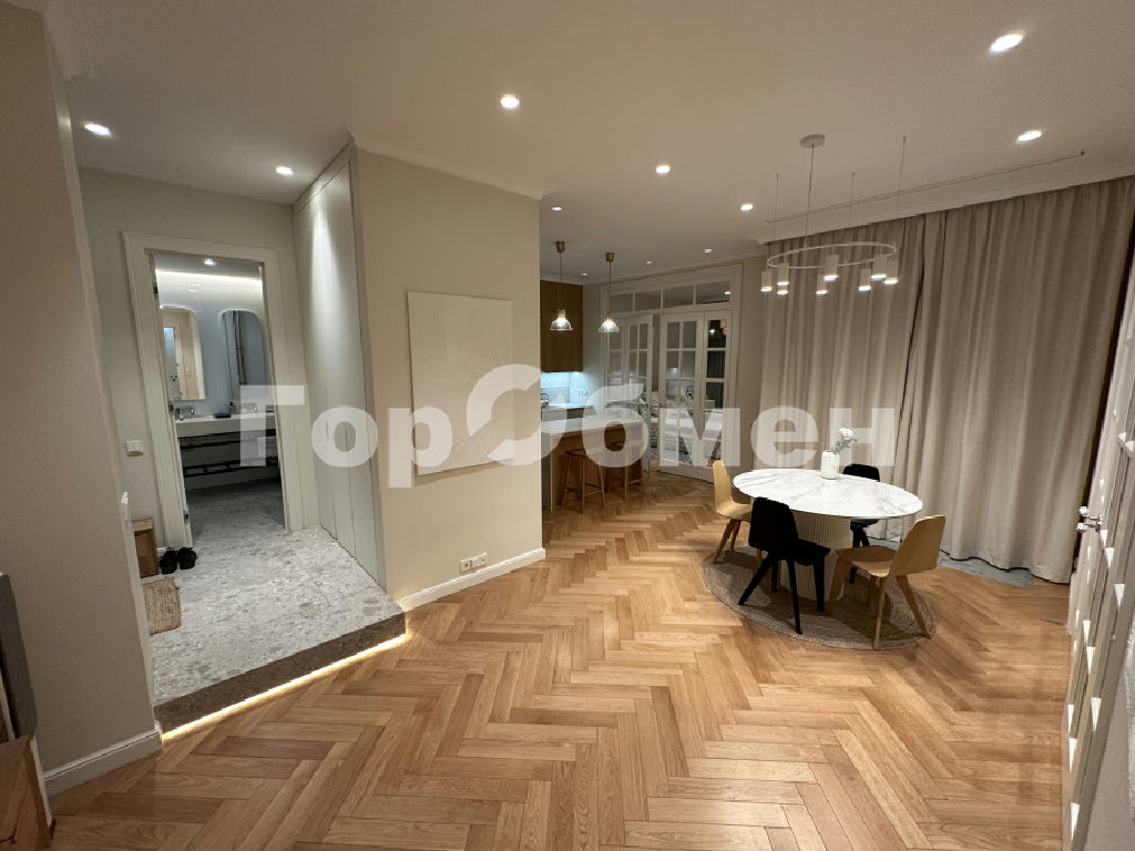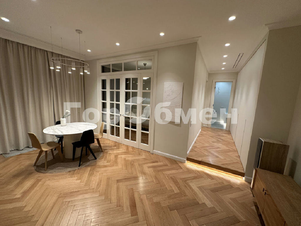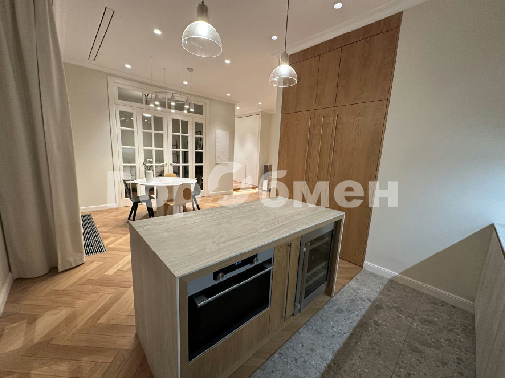 Планировка выполнена в европейском стиле: просторная кухня-гостиная (40 м2) позволяет комфортно разместить более 20 человек. Анфиладное расположение комнат и полнораспашные четырехстворчатые двери из массива дают возможность объединить пространство в единую зону. Высота потолков составляет честные 3 метра. На полу - дубовый паркет. Встроенная мебель предусмотрена в прихожей, коридоре и санузлах. Коридор организован как отдельная гардеробная.