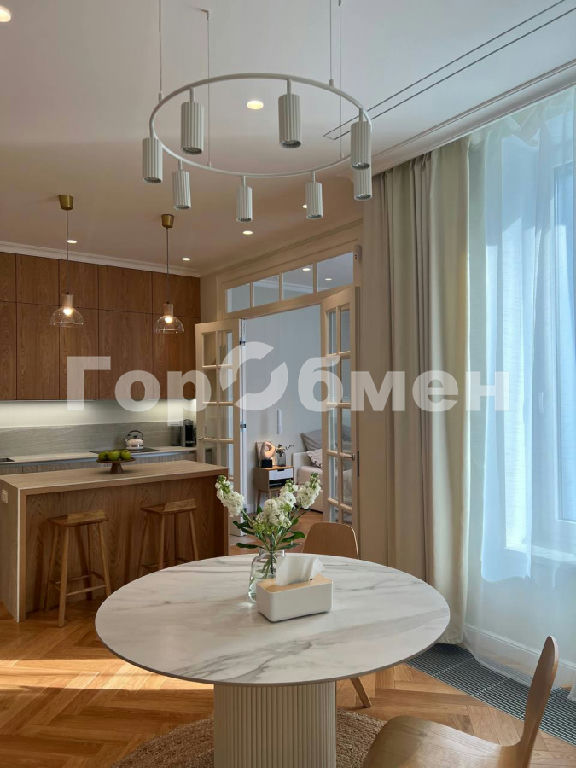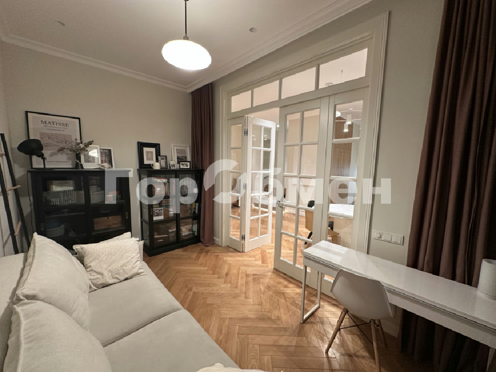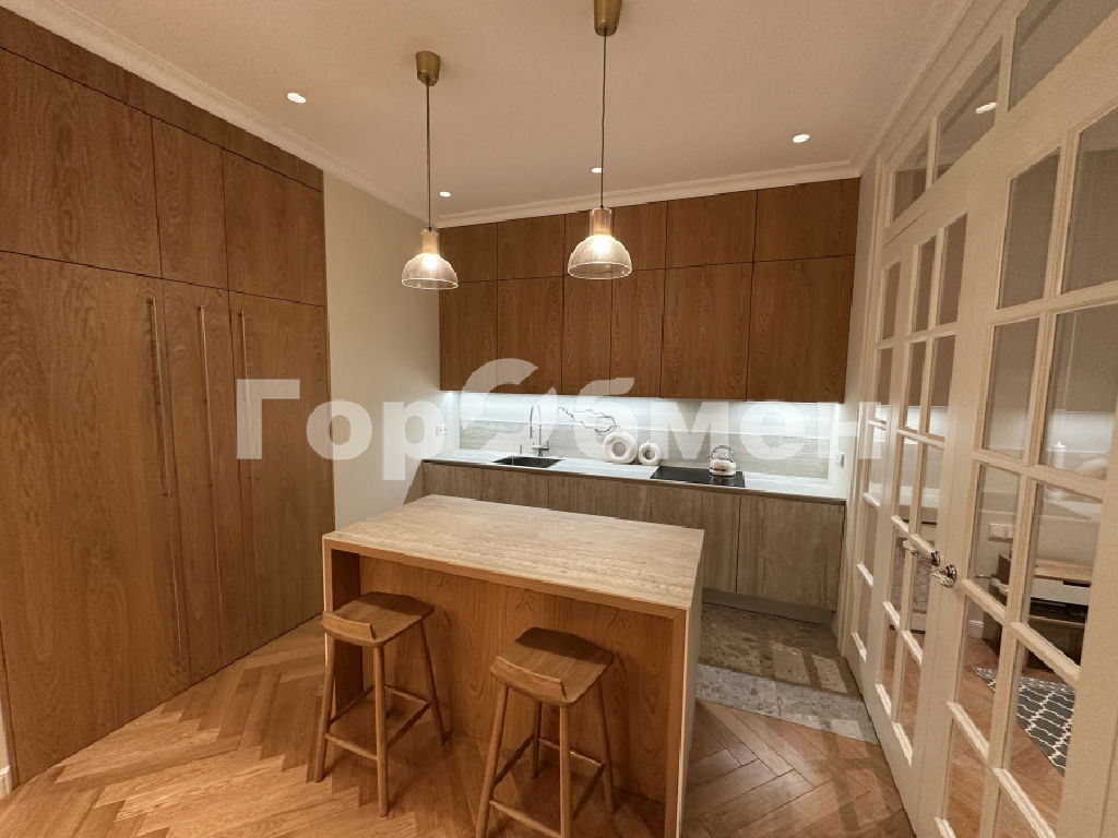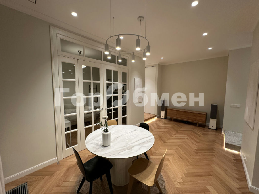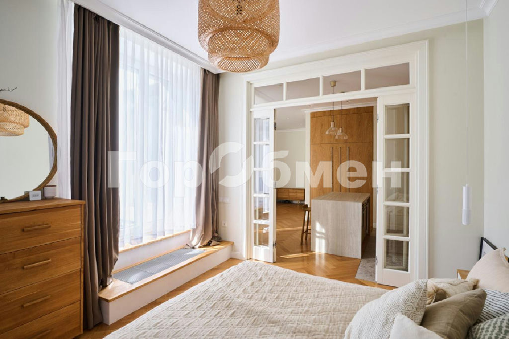Планировка выполнена в европейском стиле: просторная кухня-гостиная (40 м2) позволяет комфортно разместить более 20 человек. Анфиладное расположение комнат и полнораспашные четырехстворчатые двери из массива дают возможность объединить пространство в единую зону. Высота потолков составляет честные 3 метра. На полу - дубовый паркет. Встроенная мебель предусмотрена в прихожей, коридоре и санузлах. Коридор организован как отдельная гардеробная.